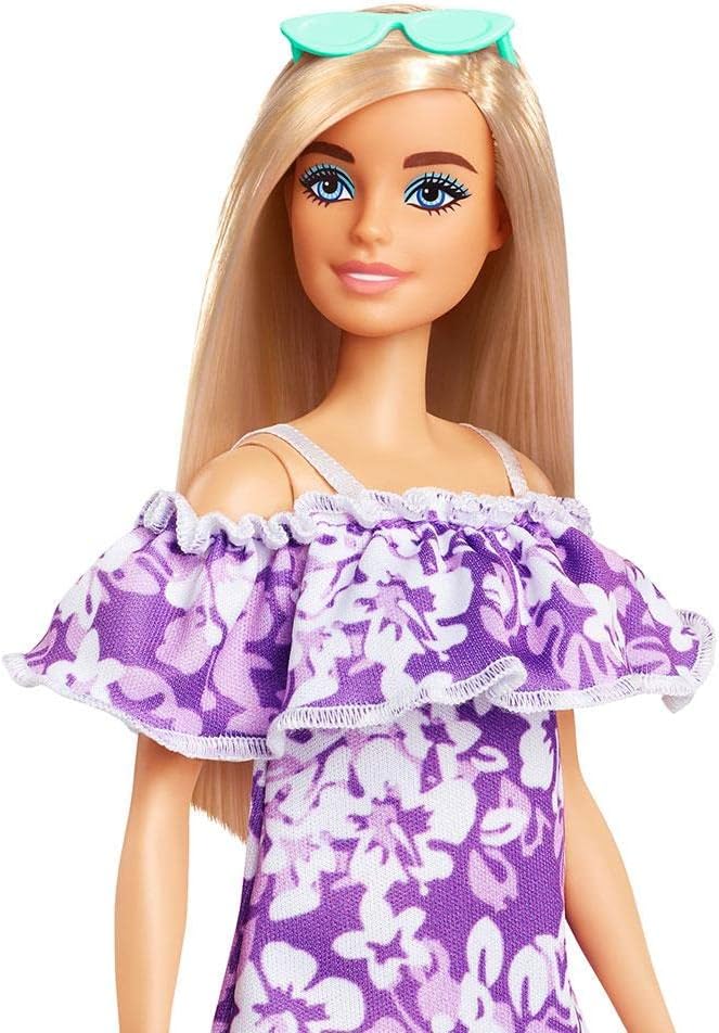 The fabric of Barbie doll’s floral print dress is made from recycled plastics and features fun ruffle details.