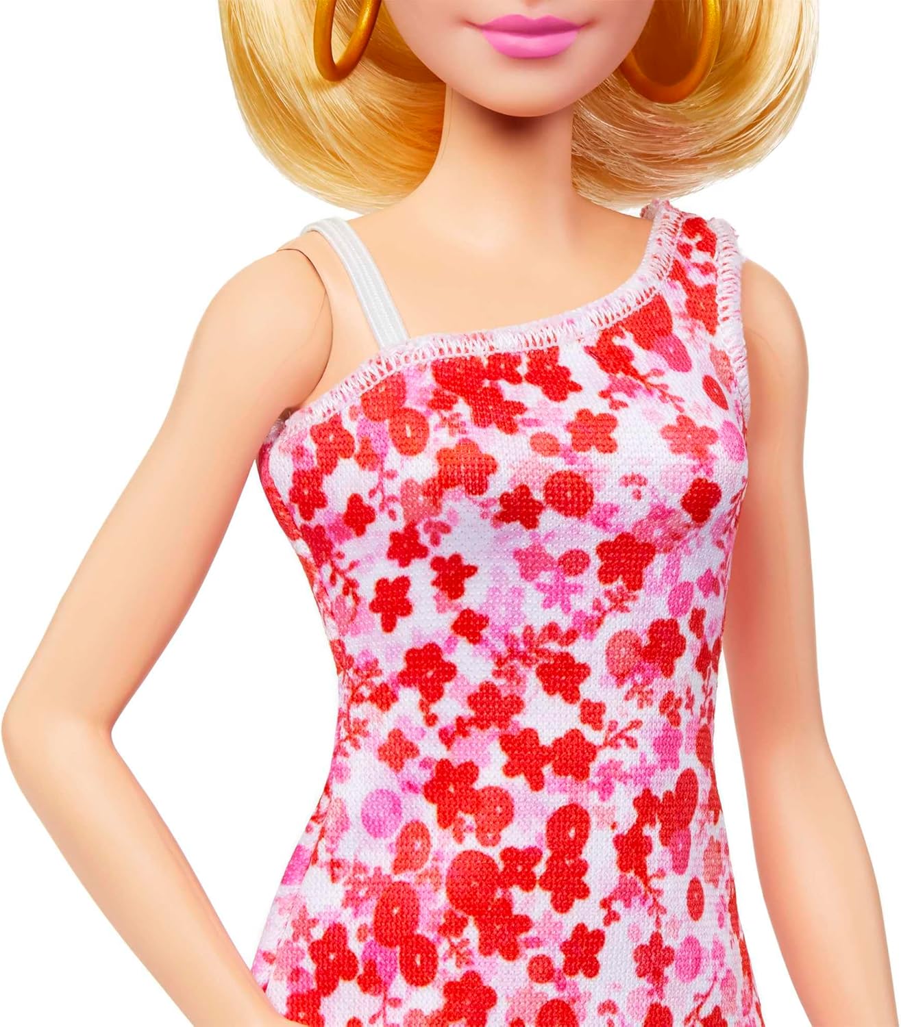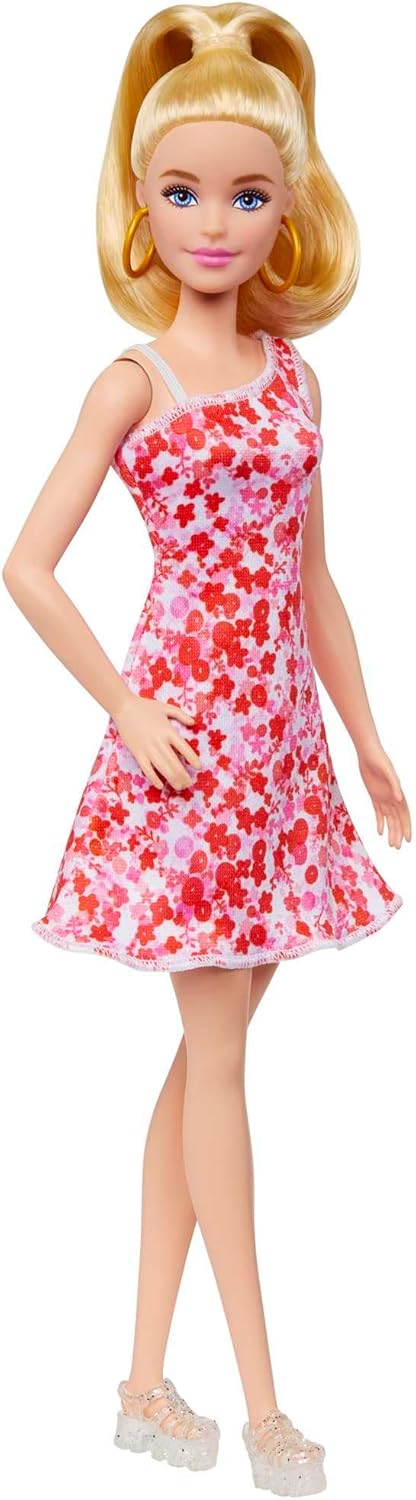 This Barbie doll styles her blond hair in a fun high ponytail! With golden hoop earrings and platform jelly sandals, her look features plenty of details that make her personality pop.