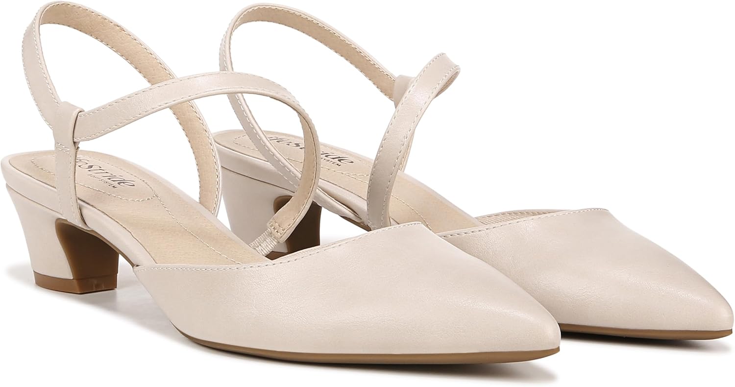 The seasonless staple. Top off any look with this gorgeous, perfectly pointed heel. Faux leather or fabric upper with a pointed toe, slip-on fit, and crisscross strap. Soft System® comfort package provides all-day support, flex, and cushioning. Traction sole provides you with extra stability. Just Right Height 1 and 1/2 inch heel.