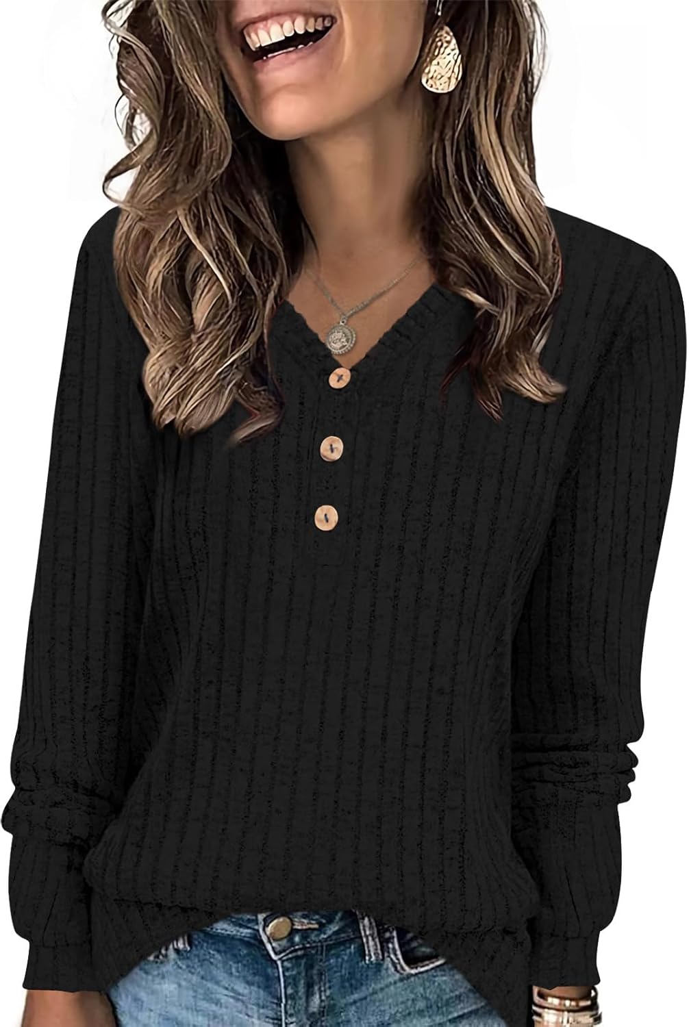 Features: long sleeve, v neck, three buttons, warm, comfy.
