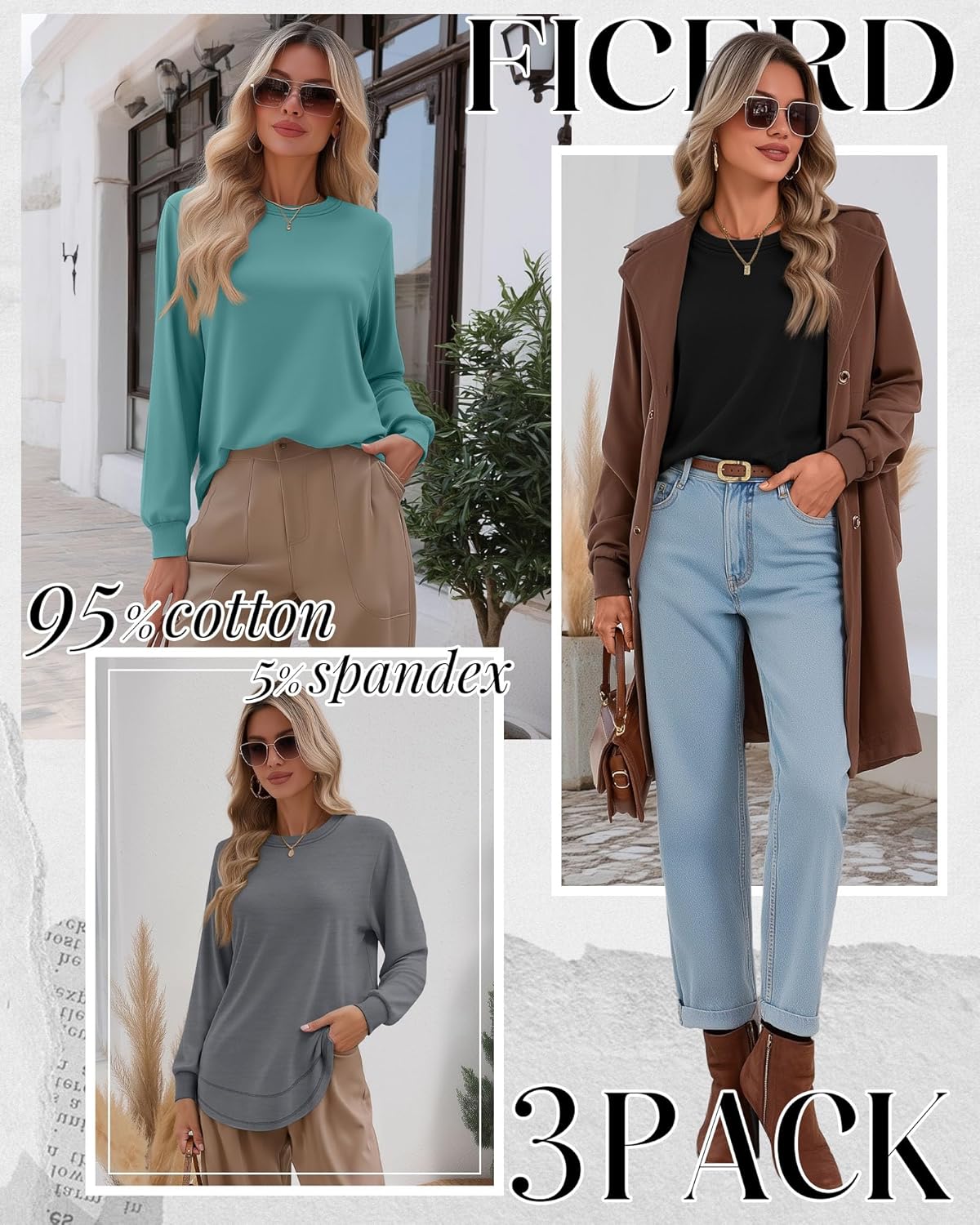 Ficerd 3 Pack Women’s Long Sleeve Shirts, Cotton Crew Neck Tunic Tops Casual Loose Fit Pullover Sweatshirts Curved Hem Shirts