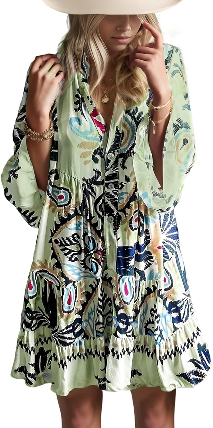 Customers find the dress pretty and comfortable, with a loose, flattering fit and lightweight fabric. The material quality receives mixed feedback, with some praising it while others find it not the best quality, and several customers note it’s see-through. The sizing is also mixed, with some finding it true to size while others say it runs big.