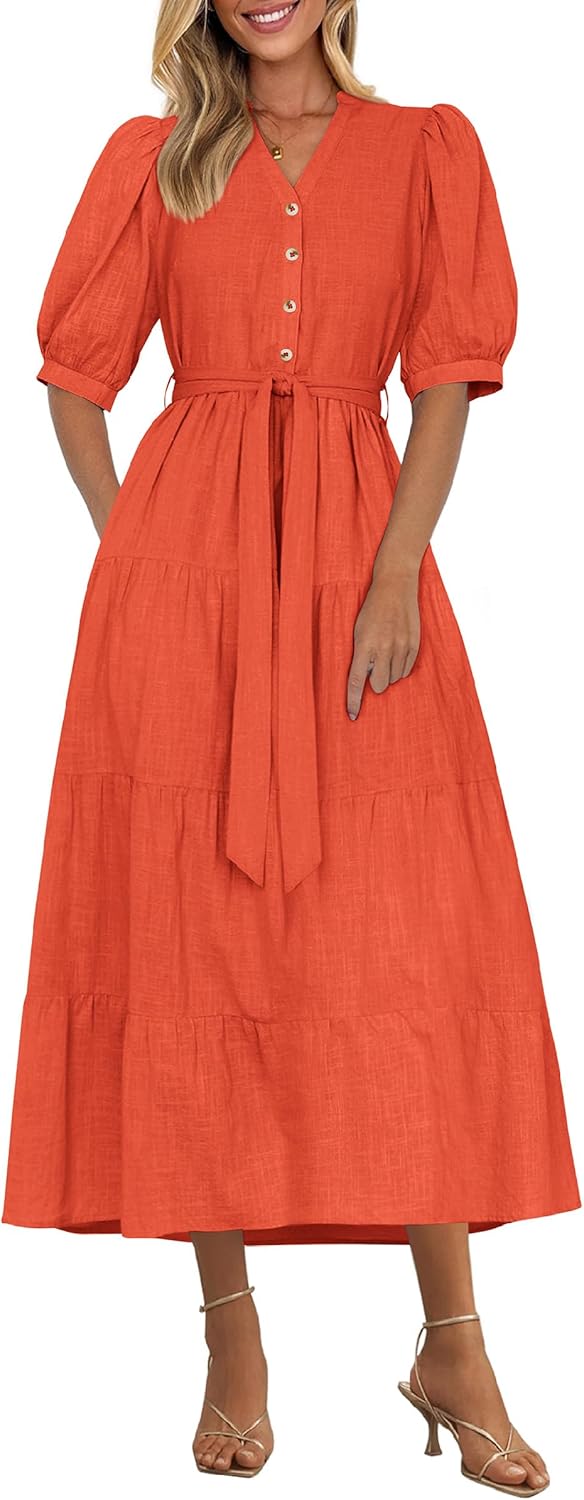 PRETTYGARDEN Midi Dresses for Women Button Down Ruffle A Line Dress