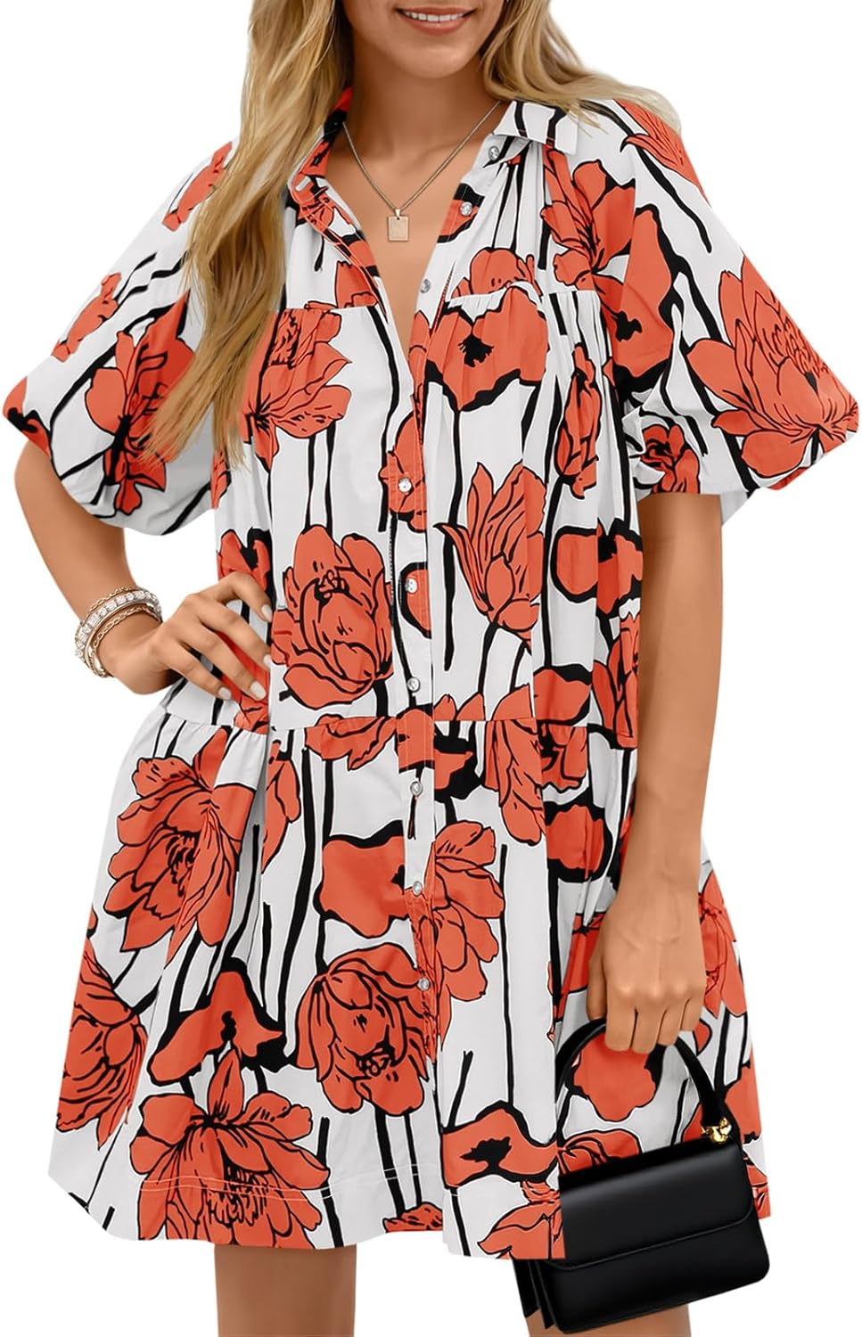 Womens Summer Floral Mini Dress Puff Short Sleeve Button Down Shirt Dresses