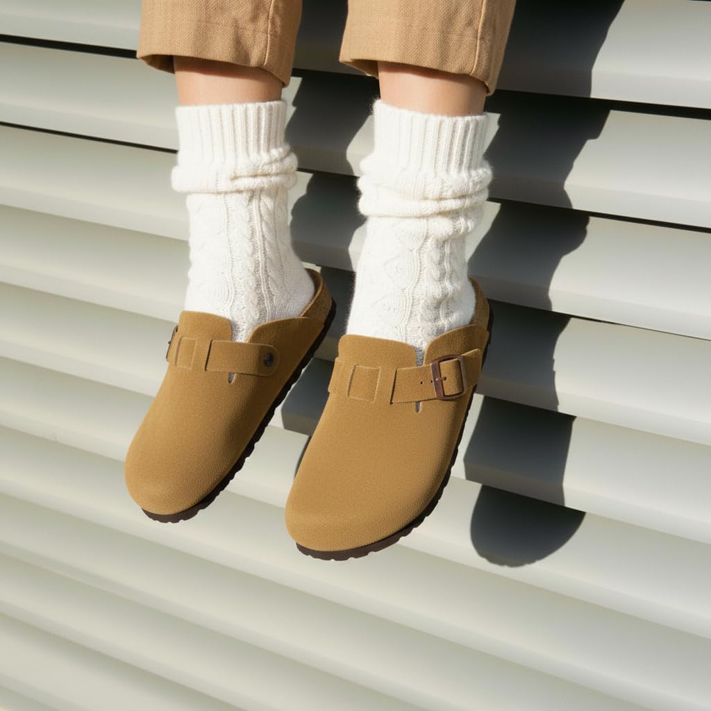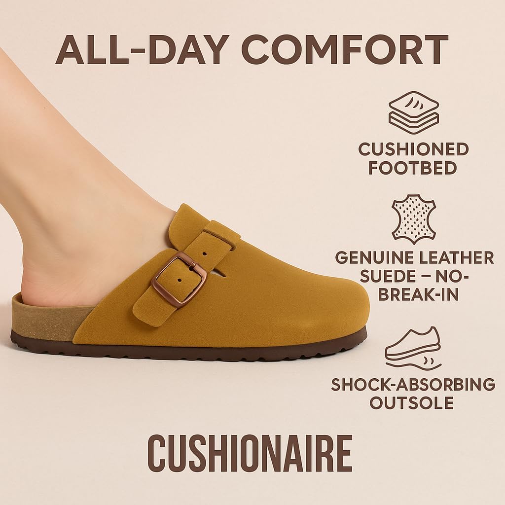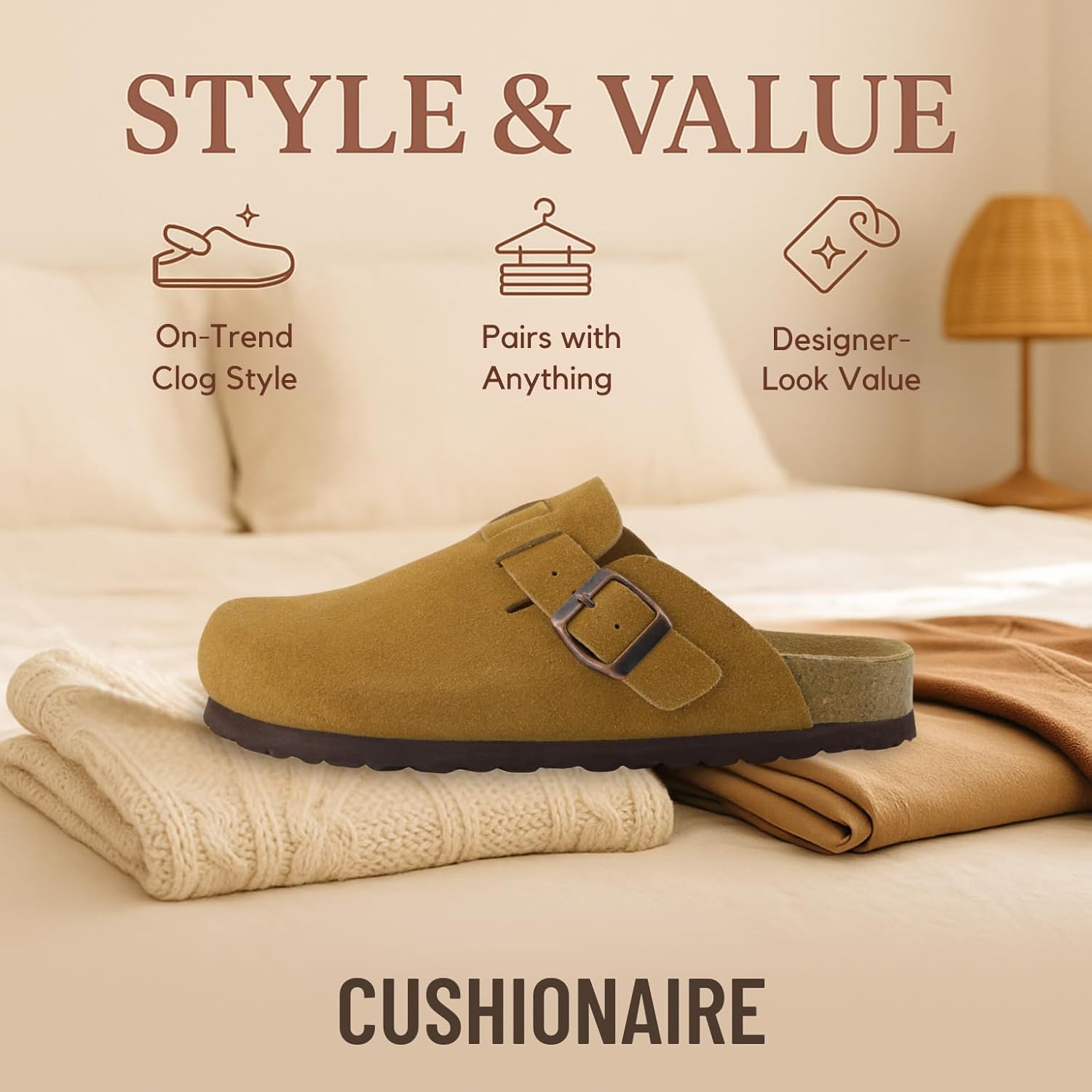 Step into comfort with the CUSHIONAIRE Hana, a versatile clog crafted from soft genuine suede. These suede clogs feature a contoured footbed that cushions every step, making them a reliable choice for work, errands, or evenings at home. The slip-on silhouette combines ease and support, giving you an effortless style that pairs with denim, trousers, or cozy layers. Designed for everyday wear, Hana works as both stylish womens mules and durable womens house shoes. The clean profile offers the coverage of closed toe sandals women can wear with ease, while still delivering the lightweight comfort of a mule. Quick to slip on, they provide the convenience of slip on slides for women with the polish of genuine suede craftsmanship. With a stable sole and roomy fit, they offer the comfort of slippers while maintaining structure for all-day use. The versatile outsole transitions easily from indoors to outdoors, so your comfort goes wherever you do. Whether styled as womens mules, relaxed womens house shoes, or classic suede clogs, Hana delivers lasting support and timeless appeal.