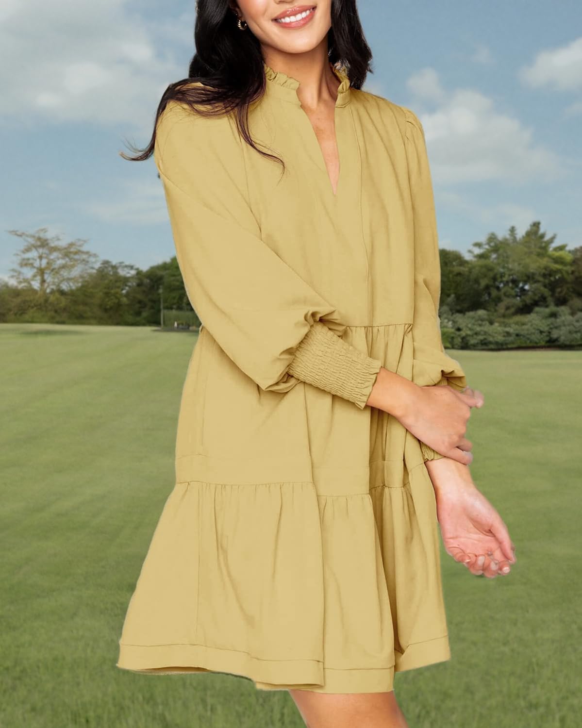 Imily Bela Casual V Neck Long Sleeve Ruffle Tiered Flowy Swing Tunic Dress