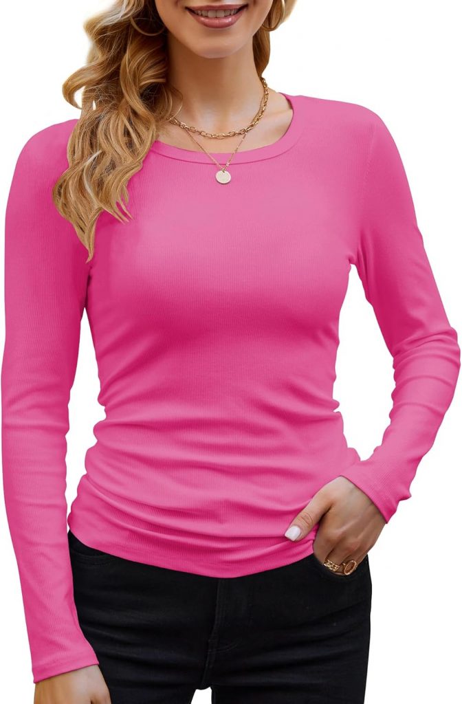 Product description GEMBERA Womens Ribbed Long Sleeve Crewneck Casual Slim Basic Shirts Fitted Knit Tops