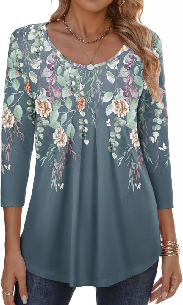Product description womens shirts 3/4 length sleeve Pleated tops fashion clothing Flower pattern design Boho