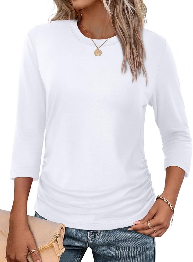 Core product features include:3/4 length sleeve womens tops,crewneck,ruched,solid and floral colors,womens summer tops,summer tops for