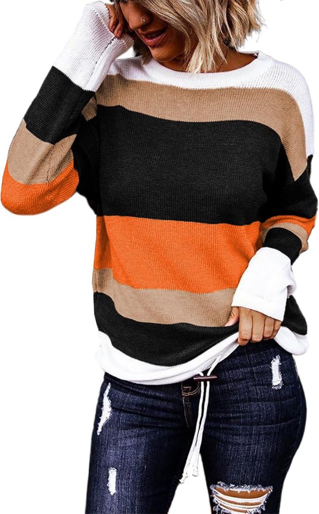 Dokotoo Womens Sweaters Striped Fall Winter Outfits 2025 Crewneck Drawstring Color Block Fashion Clothing