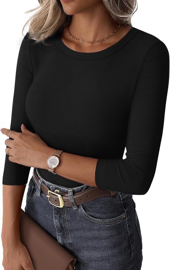 Womens 3/4 Sleeve Tops Ribbed Knit Slim Fitted Tight Shirts Crewneck Basic Tee Tshirt 2025 Fall Casual Outfits